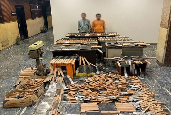 تم إستهدافهما وأمكن ضبطهما ، وبحوزتهما (1205 قطعة سلاح أبيض "مختلفة الأشكال والأنواع" – الأدوات والمعدات المستخدمة فى التصنيع) ، وبمواجهتهما إعترفا بإرتكاب الواقعة على النحو المشار إليه..تم إتخاذ الإجراءات القانونية.