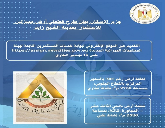 وفي السياق ذاته، أعلن وزير الإسكان عن طرح قطعتي أرض مميزتين للاستثمار بمدينة الشيخ زايد عبر الموقع الإلكتروني لبوابة خدمات المستثمرين التابعة لهيئة المجتمعات العمرانية الجديدة حتى 15 نوفمبر الجاري.