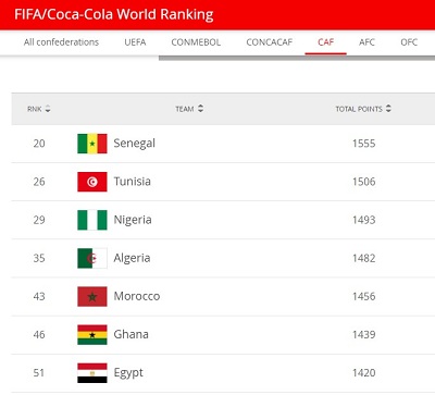 أعلن الاتحاد الدولى لكرة القدم "فيفا" التصنيف الشهرى الجديد، وحافظ فيه منتخبنا الوطنى على المركز 51 عالميا والسابع أفريقياً والرابع عربياً، حيث تصدر منتخب السنغال ترتيب الأفارقة وجاء فى المركز الـ20 عالميا ويليه تونس الـ26، ونيجيريا الـ29، والجزائر الـ35، والمغرب الـ43، ثم غانا فى المركز الـ46 قبل الفراعنة، وعربيا جاء المنتخب فى المركز الرابع بعد كل من تونس والمغرب وقطر.