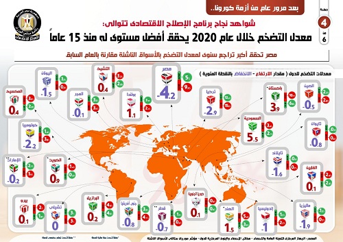 وفي هذا الصدد، نشر المركز الإعلامي لمجلس الوزراء، تقريراً تضمن إنفوجرافات تسلط الضوء على تتابع شواهد نجاح برنامج الإصلاح الاقتصادي، حيث سجل معدل التضخم خلال عام 2020 أفضل مستوى له منذ 15 عاماً، وذلك على الرغم من أزمة كورونا.