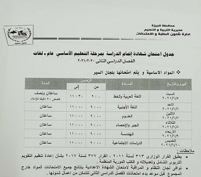 اعتمد اللواء أحمد راشد، محافظ الجيزة، ومجدى الجيار، وكيل مديرية التربية والتعليم بالجيزة، جدول امتحان شهادة إتمام الصف الثالث الاعدادى "عام ولغات " للفصل الدراسى الثانى للعام الدراسى 2020/2021.