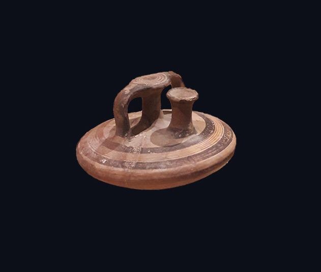 يعرض إناء دائري الشكل يشبه الزمزمية له رقبة تنتهي بدائرة لها ما يشبه الاذنين، يرجع للعصر اليوناني الروماني.