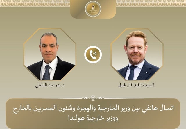 تلقي د. بدر عبد العاطى وزير الخارجية والهجرة وشئون المصريين بالخارج اتصالاً هاتفياً من "دافيد فان فييل" وزير خارجية هولندا لبحث العلاقات الثنائية وتبادل الرؤى بشأن تطورات القضية الفلسطينية.