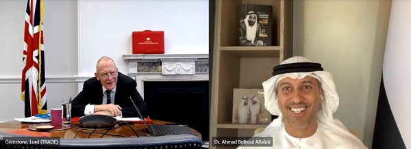 بحث الدكتور أحمد بالهول الفلاسي، وزير دولة لريادة الأعمال والمشاريع والصغيرة والمتوسطة مع اللورد جيرالد إدغار غريمستون، وزير الاستثمار لدى وزارة التجارة الدولية ولدى وزارة الأعمال والطاقة والاستراتيجية الصناعية في المملكة المتحدة، سبل تعزيز التعاون الاقتصادي وتنويع الشراكات الاستثمارية ضمن قطاعي السياحة والمشاريع الصغيرة والمتوسطة بين كل من دولة الإمارات العربية المتحدة وبريطانيا.