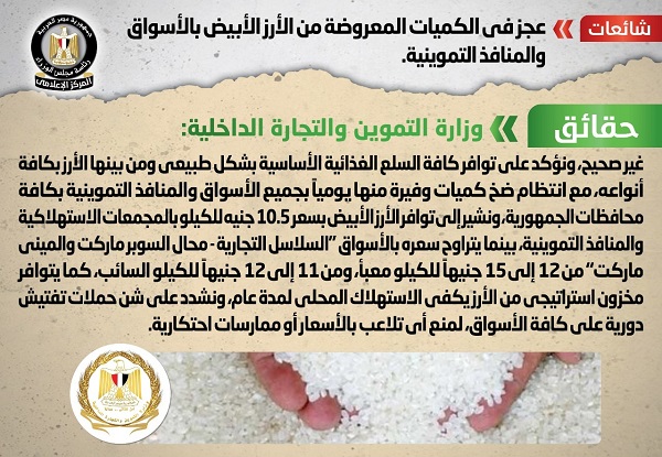 كشف المركز الإعلامي لمجلس الوزراء إنه فى ضوء ما تردد من أنباء بشأن عجز في الكميات المعروضة من الأرز الأبيض بالأسواق والمنافذ التموينية.