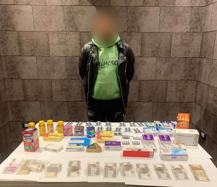 تمكنت مباحث قسم شرطة الزيتون بمديرية أمن القاهرة من ضبط أحد الأشخاص- مقيم بدائرة قسم شرطة الزاوية الحمراء أثناء سيره عكس الإتجاه مستقلاً دراجة نارية.. وبحوزته حقيبة عُثر بداخلها على مجموعة من الأدوية بإجمالى عدد 1307 "قرص، كبسولة، أمبول"- عدد 10 أكياس "جميعها مجهولة المصدر ومهربة جمركياً وغير مصحوبة بأية مستندات تدل على مصدرها وغير مسجلة - مبلغ مالى.