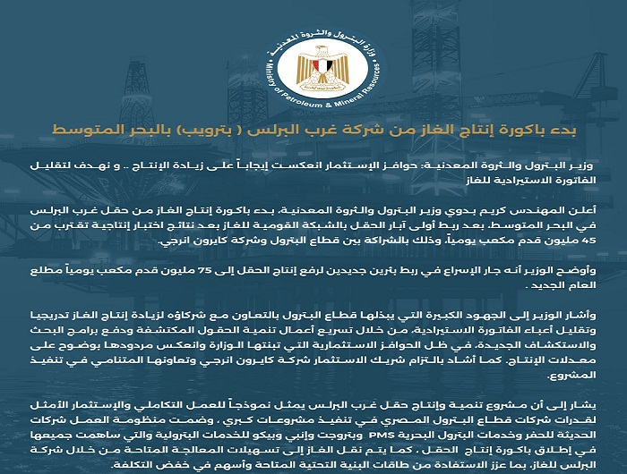 أعلن المهندس كريم بدوي وزير البترول والثروة المعدنية، بدء باكورة إنتاج الغاز من حقل غرب البرلس في البحر المتوسط، بعد,,,